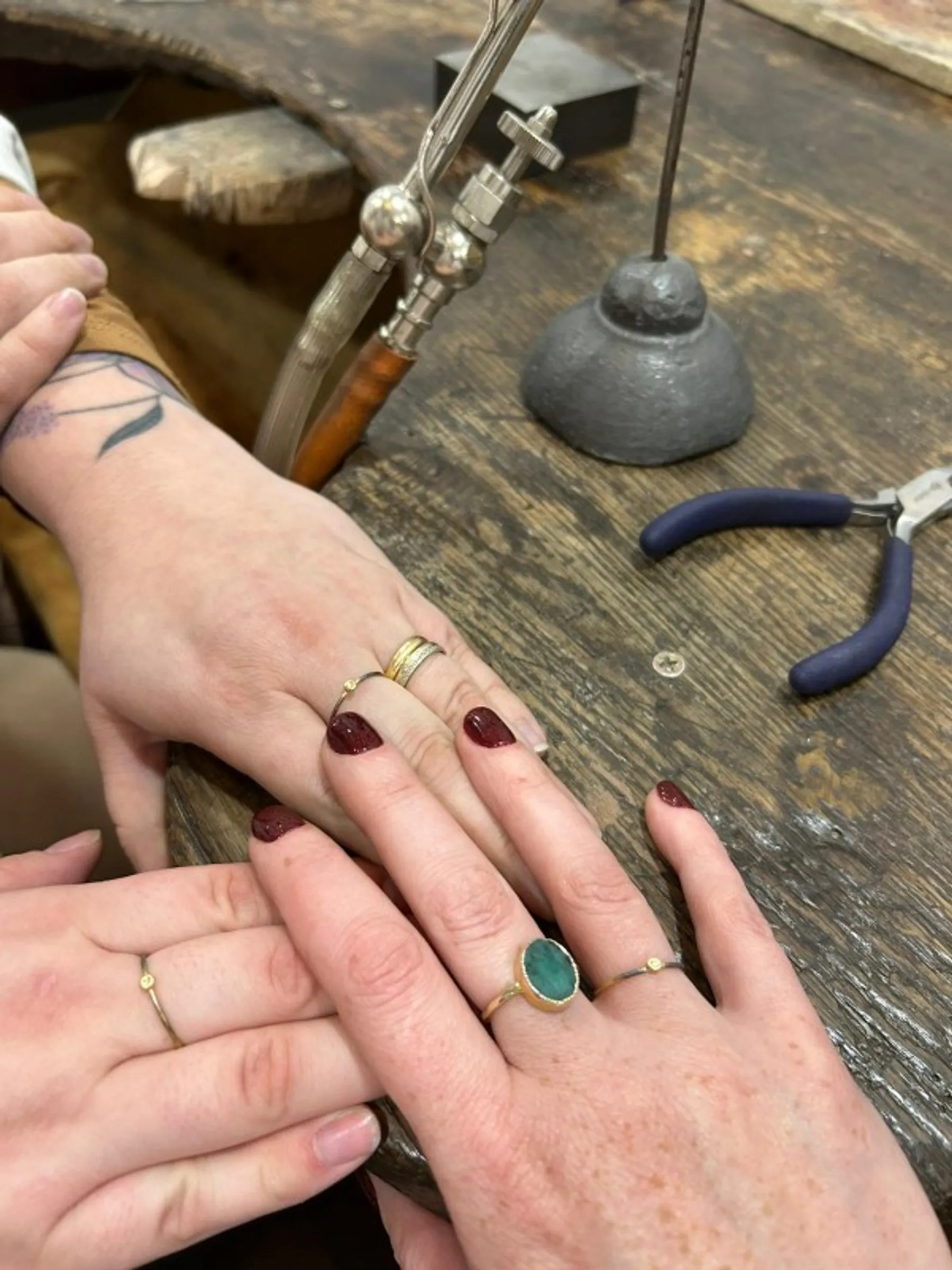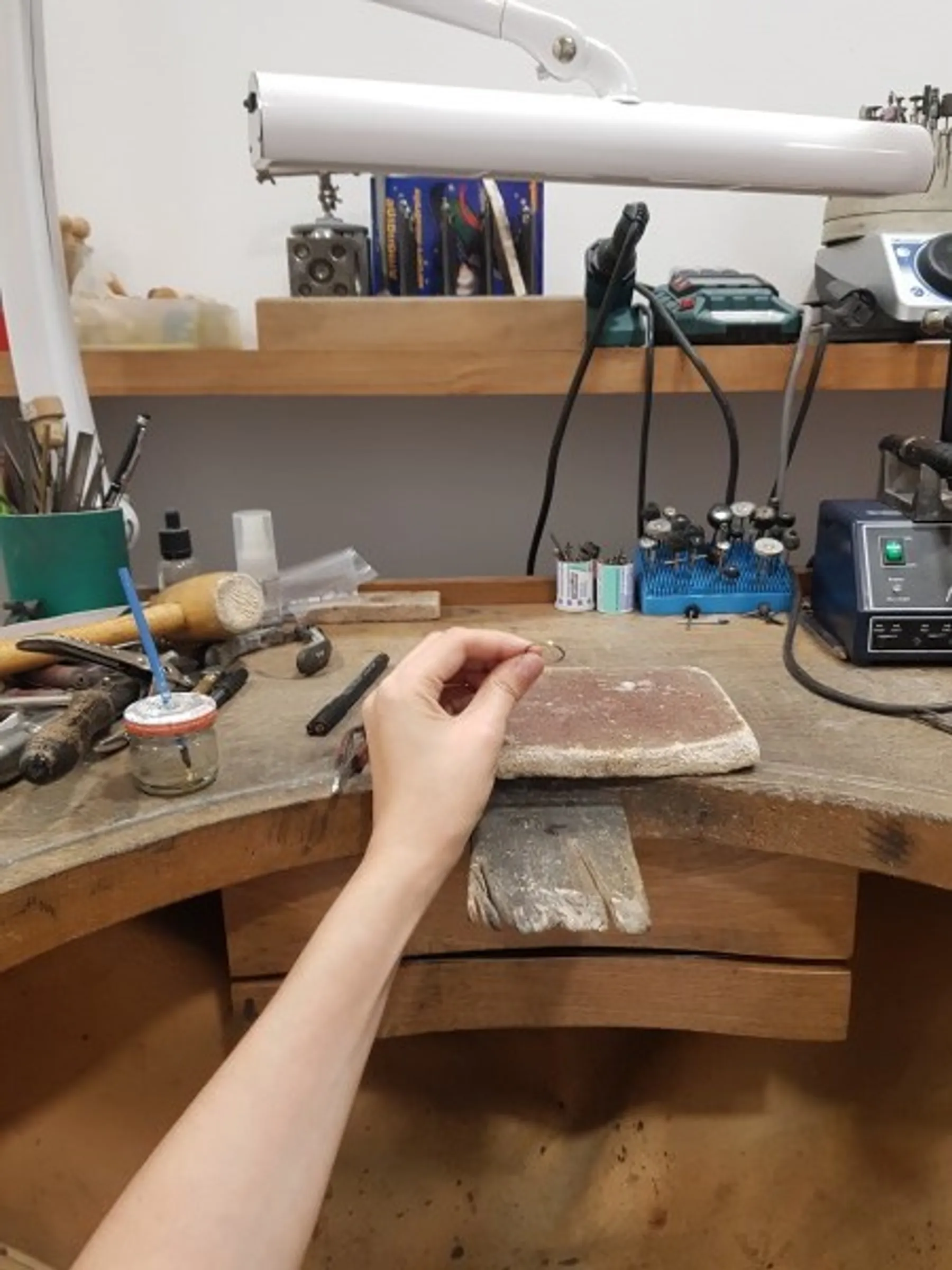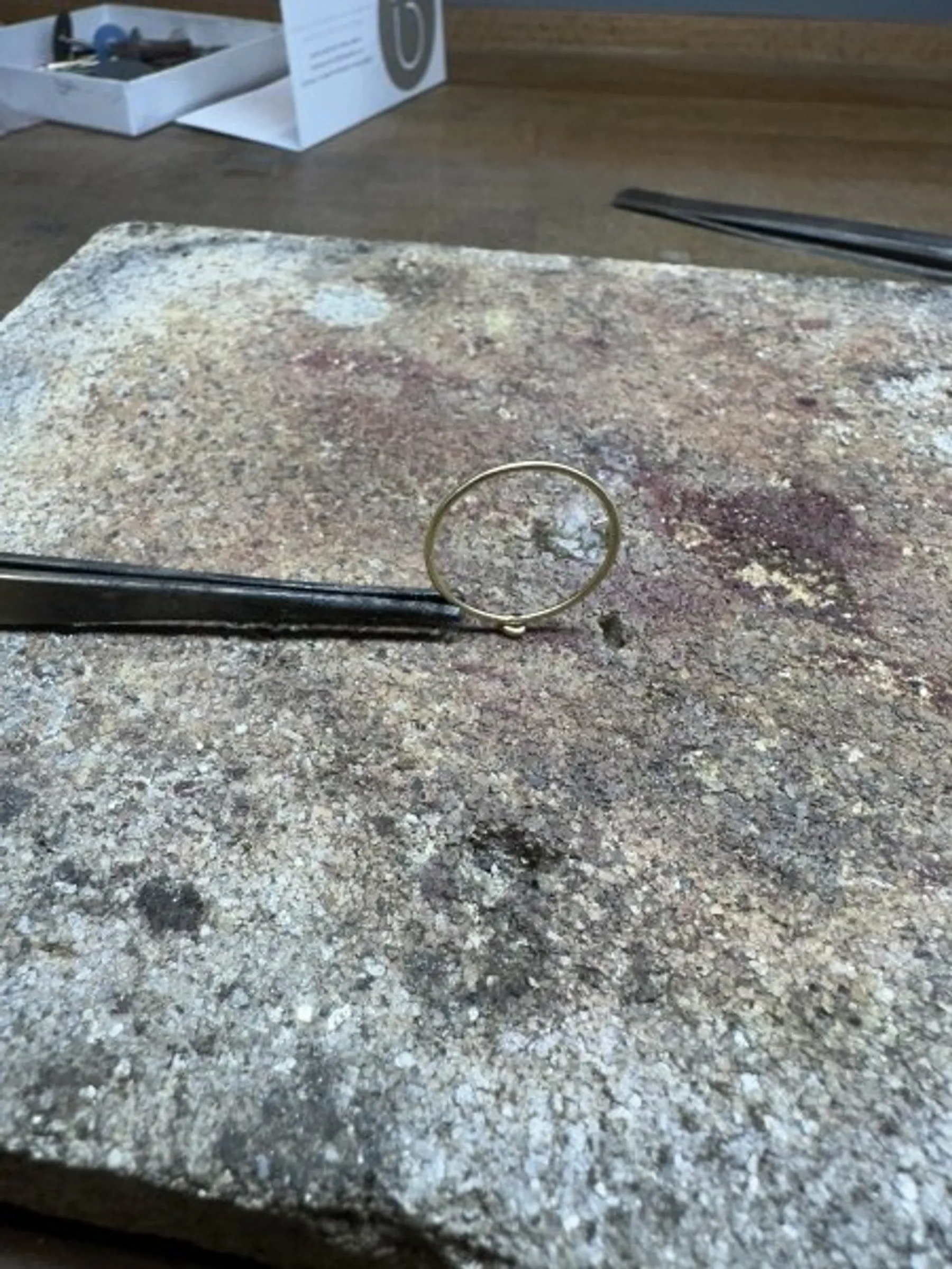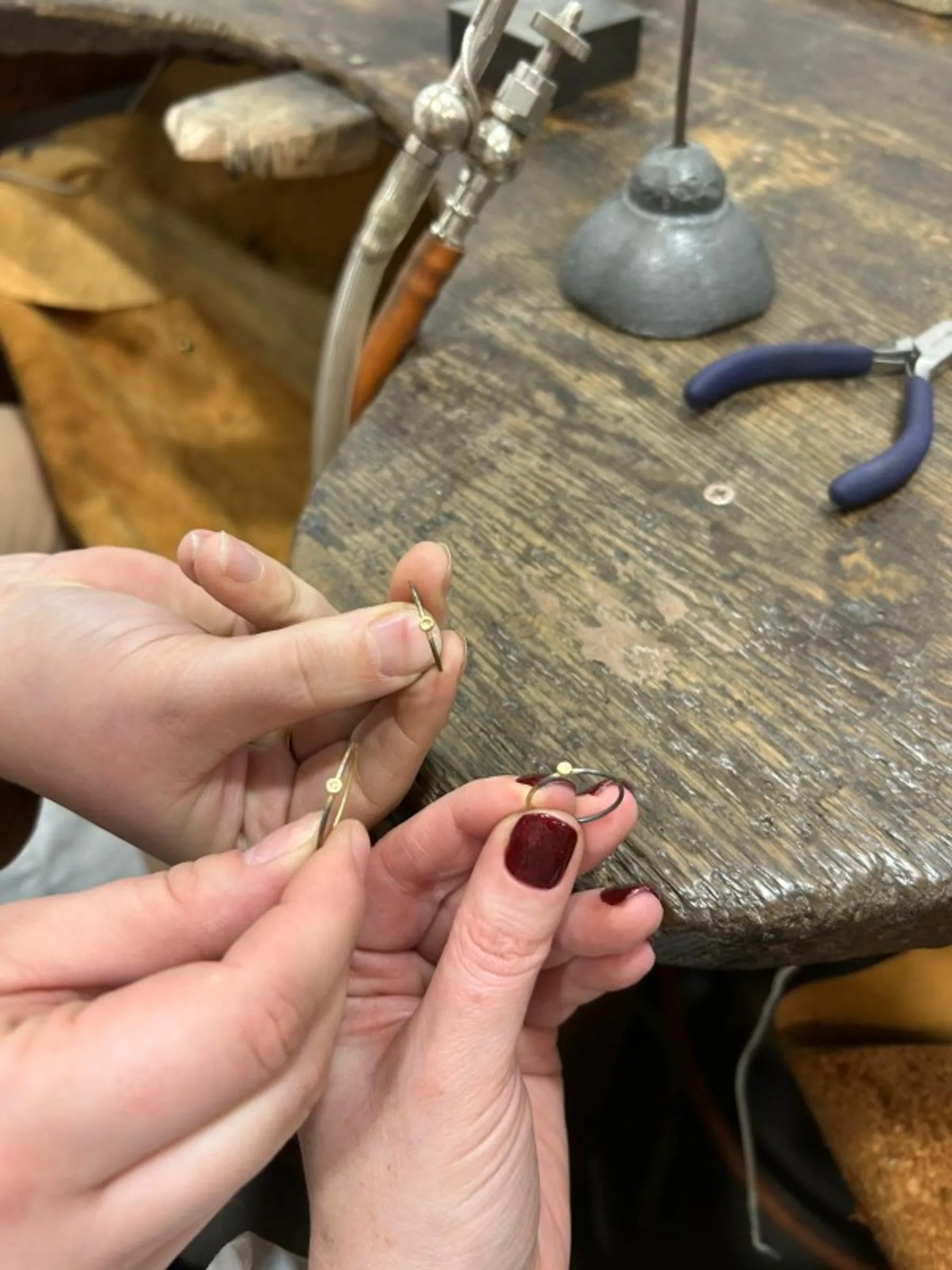 Dans l'atelier, vous prenez place à l'établi où vous commencerez par tourner le fil d'or, le souder à l'aide du chalumeau. Cet anneau est ensuite limé et légèrement émeriser à l'aide d'outil spécifique.