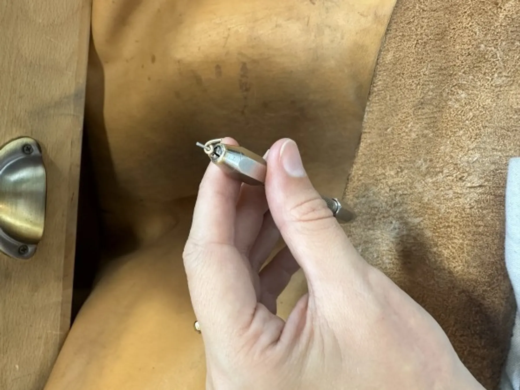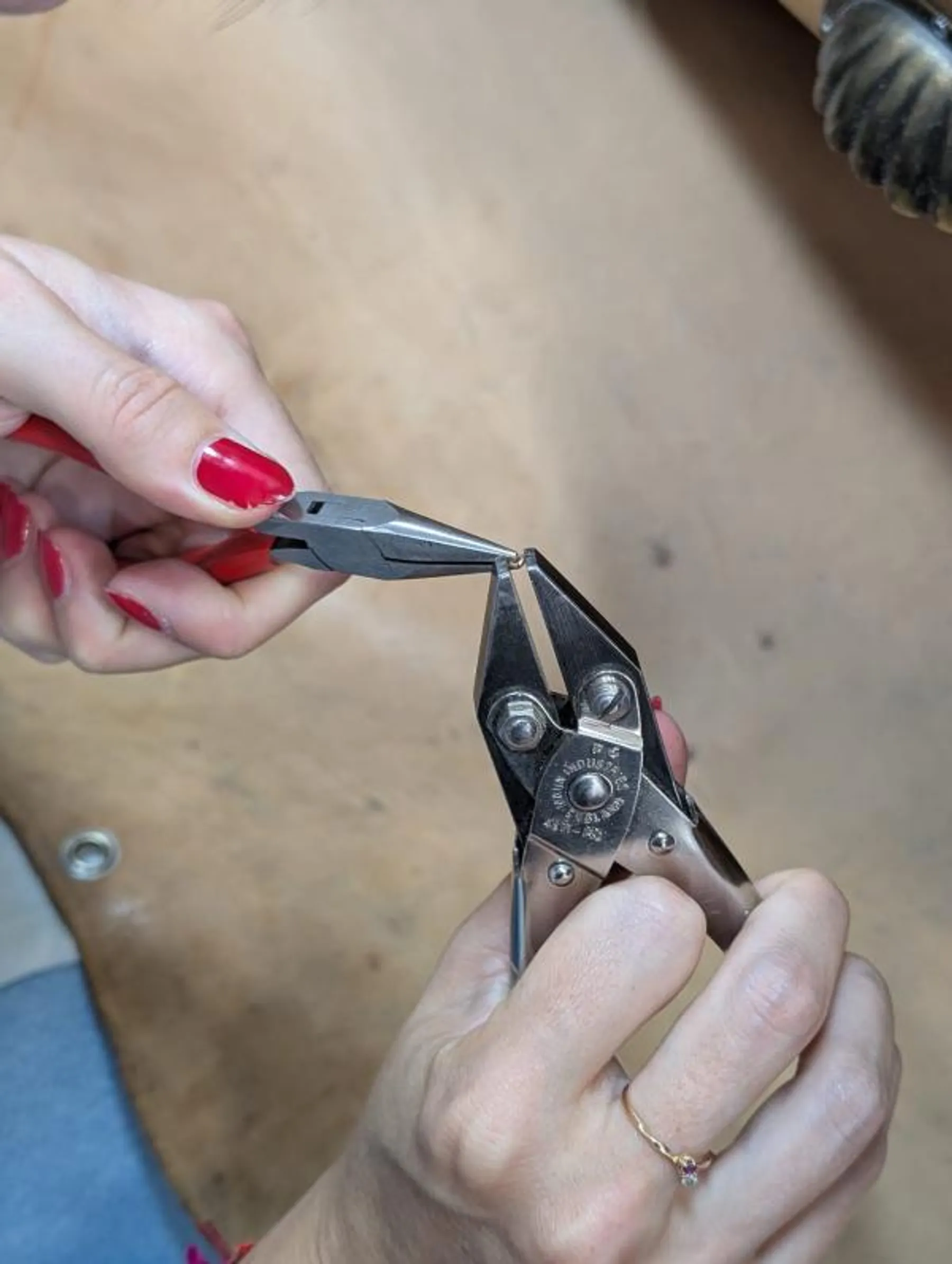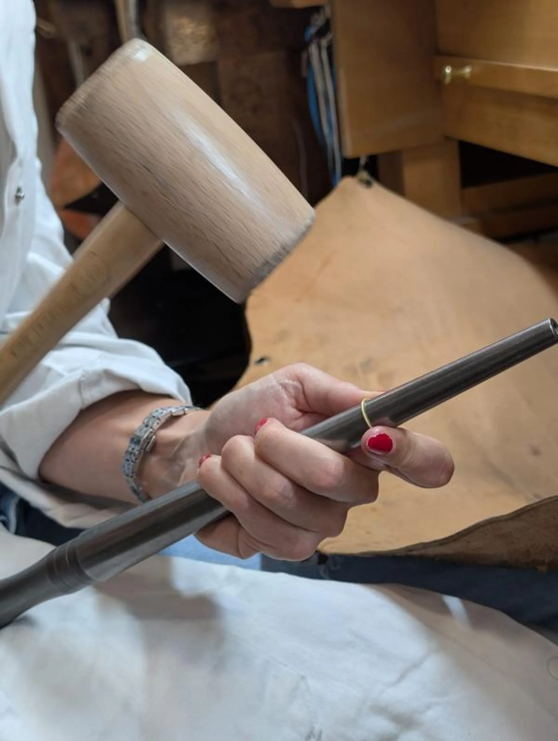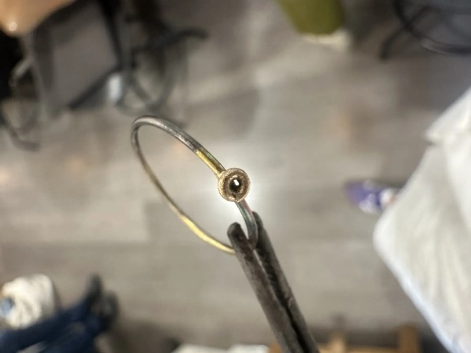 Dans l'atelier, vous prenez place à l'établi où vous commencerez par tourner le fil d'or, le souder à l'aide du chalumeau. Cet anneau est ensuite limé et légèrement émeriser à l'aide d'outil spécifique.