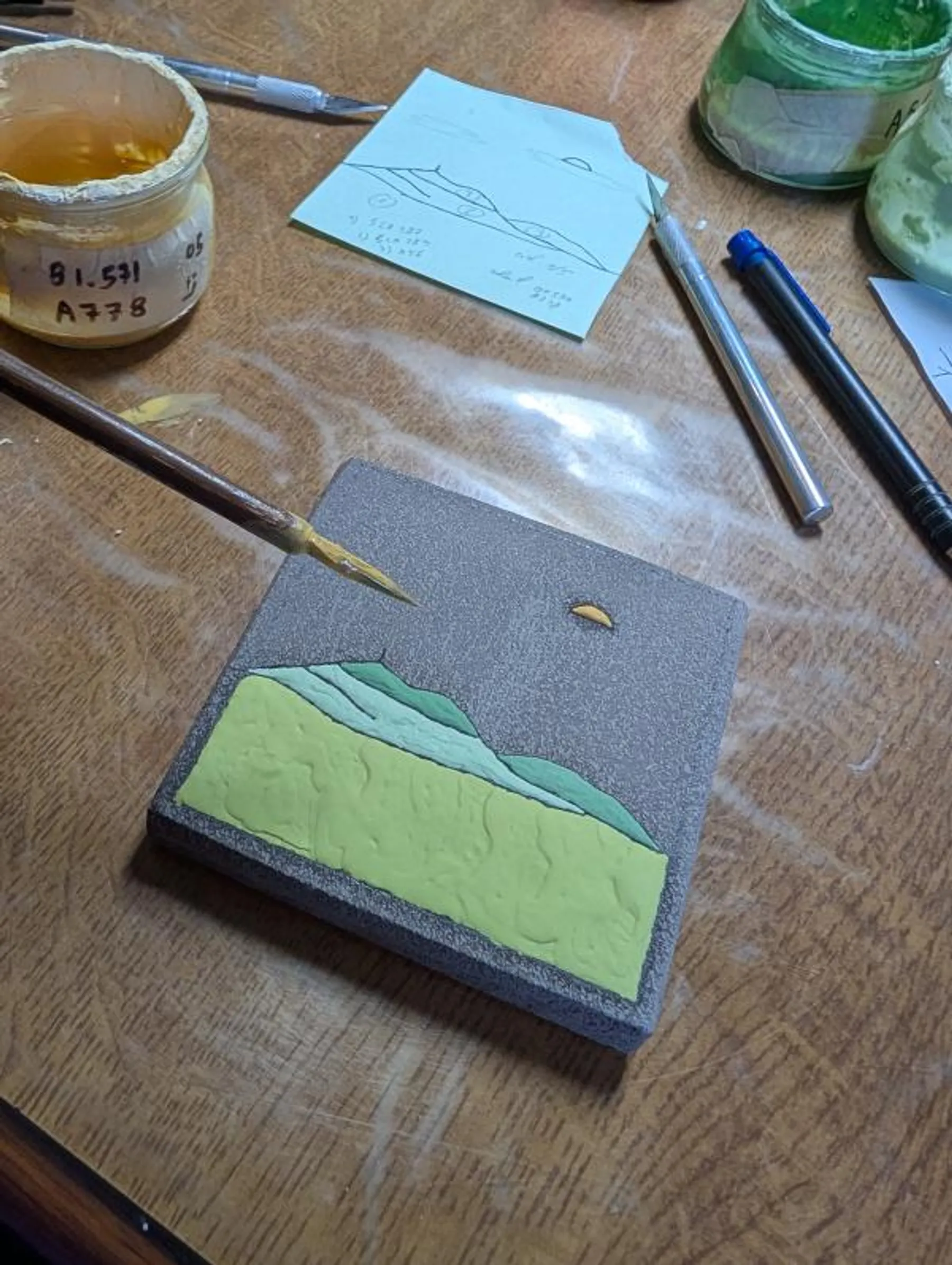 Florence et Luc vous accompagneront dans la pesée et le mélange des émaux. Puis, grâce à un pinceau, vous déposerez l'émail sur la pierre. Le trait de carbone permet de créer une cloison entre les couleurs.