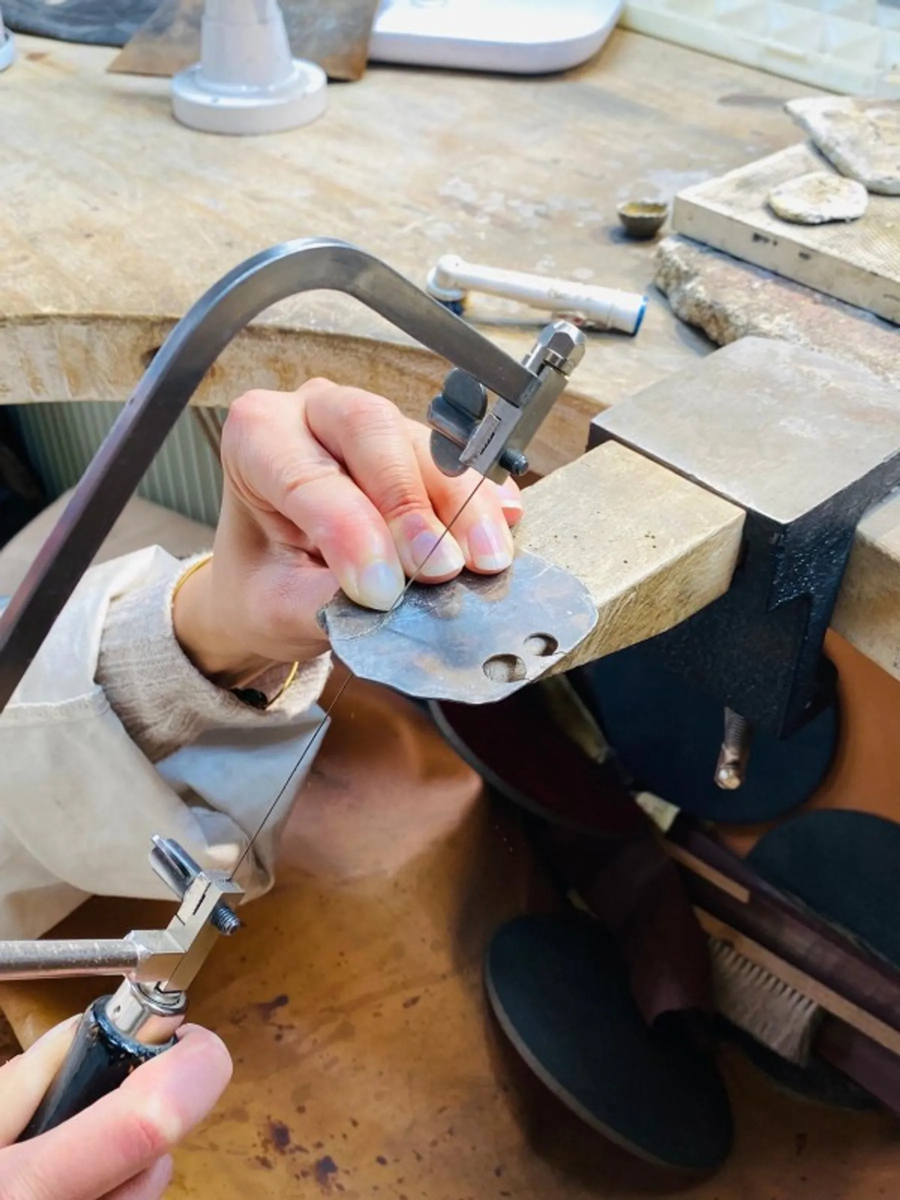 Après avoir réfléchi ensemble à vos envies et déterminé quel modèle de bague vous souhaitez réaliser, vous allez pouvoir prendre place derrière l’établi ! Vous pourrez alors découper l’argent sous forme de plaque à l’aide d'un bocfil, c’est la petite scie à main du bijoutier.