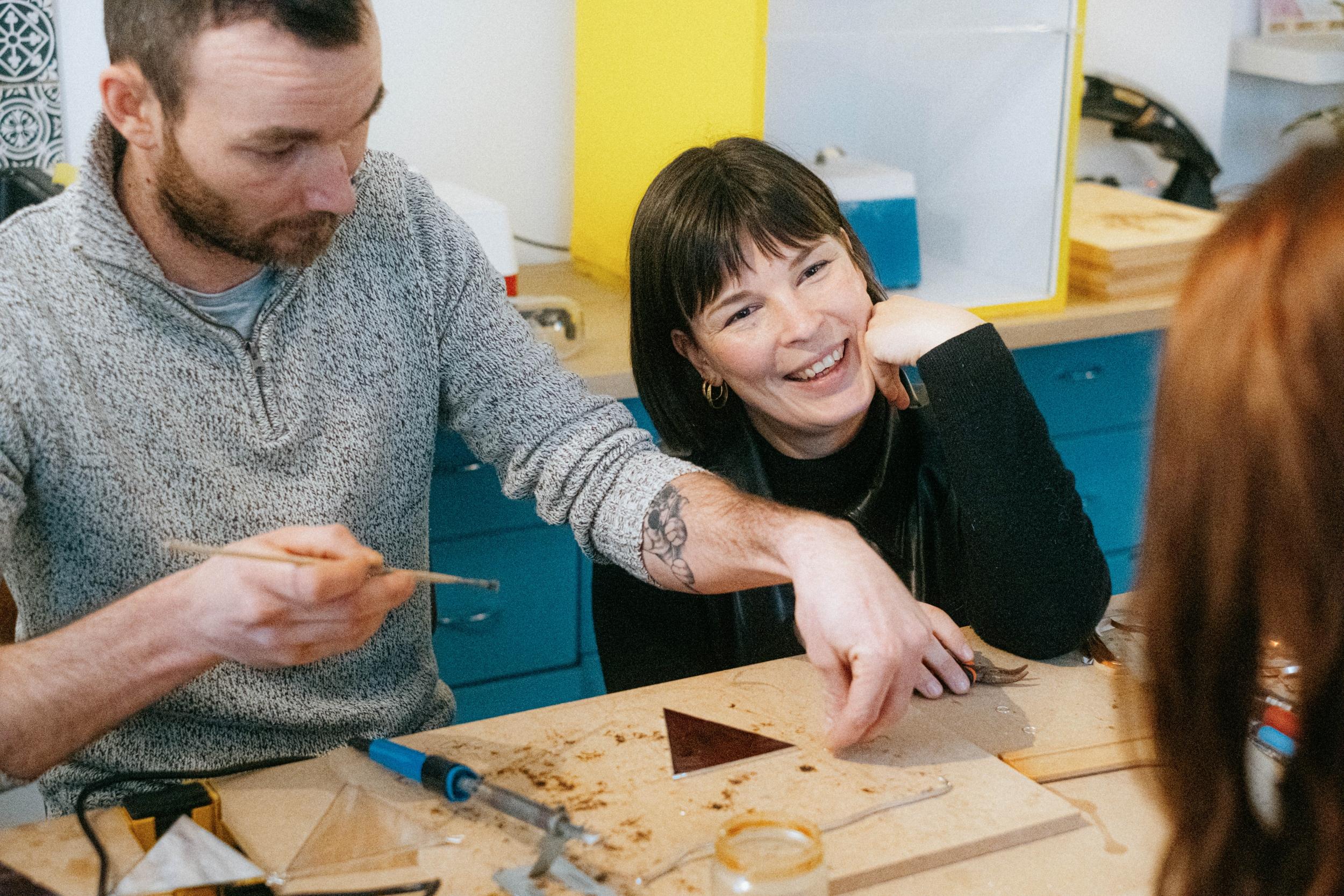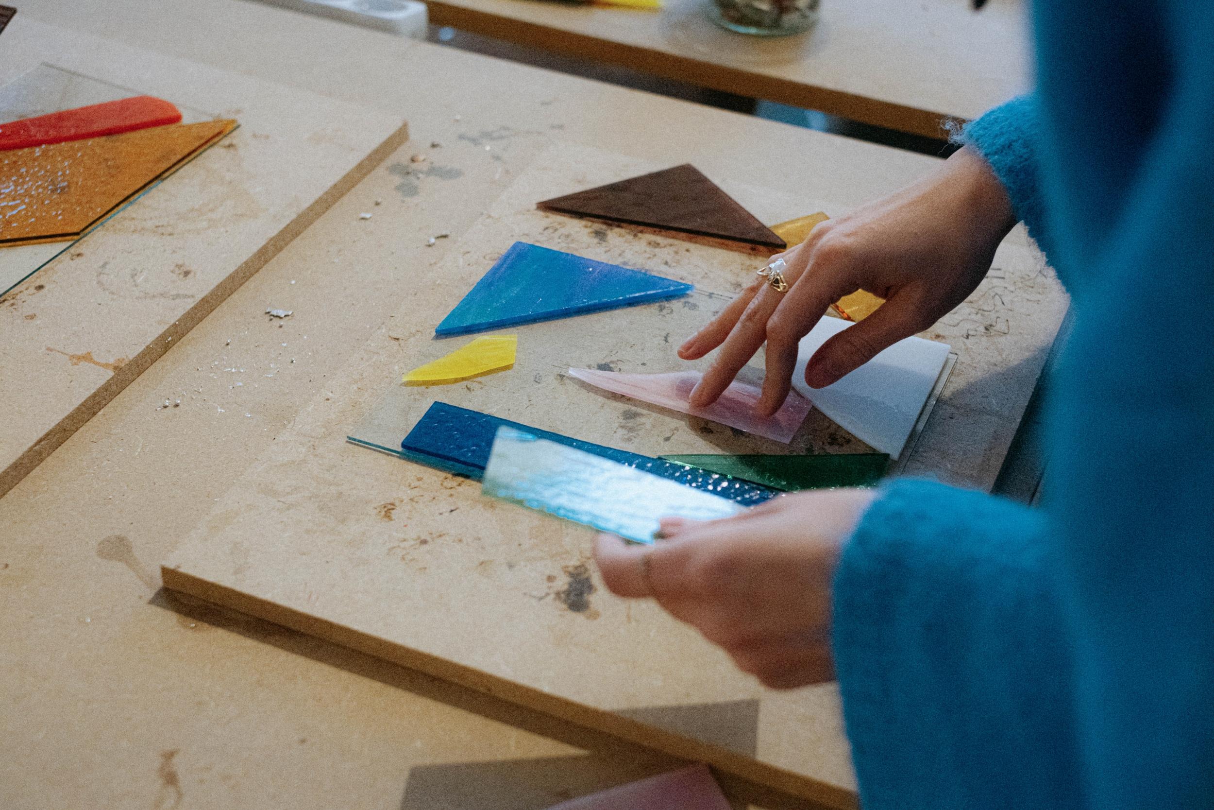 • Découverte des matériaux : travaillez à partir de morceaux de verre, de tailles, formes et matières variées, disponibles sur place. Les plaques de verre utilisées proviennent de vitres récupérées : l’artisane rachète des chutes de verre et des vitres issues de chantiers, dans une démarche d’économie circulaire.