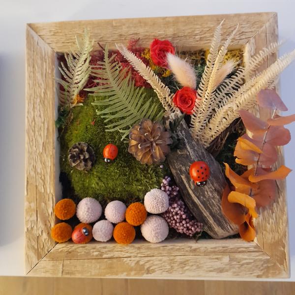 Celle-ci vous ouvre les portes de son charmant atelier, où vous aurez l'opportunité de composer votre propre tableau végétal stabilisé d'environ 25 x 25 cm.