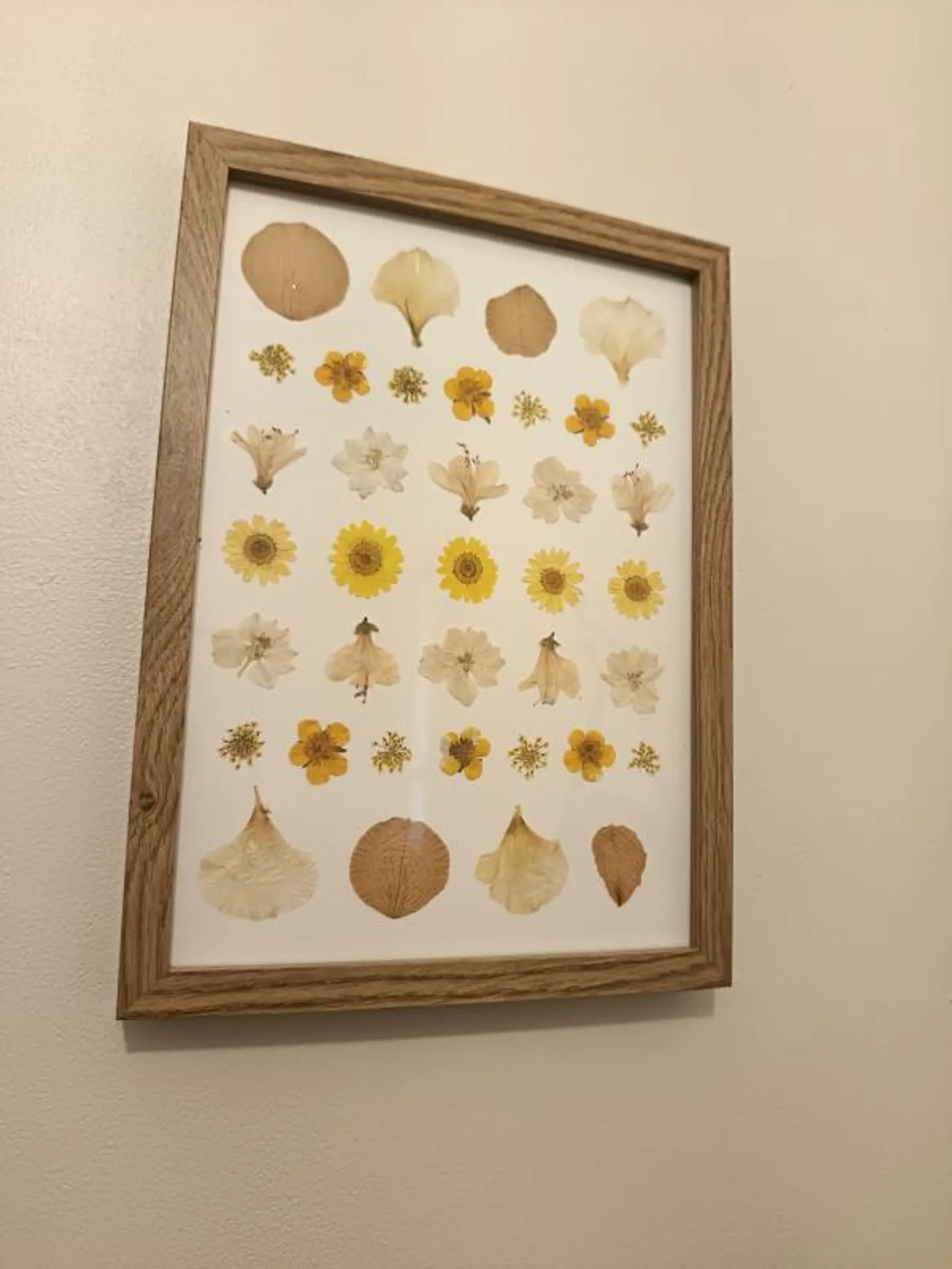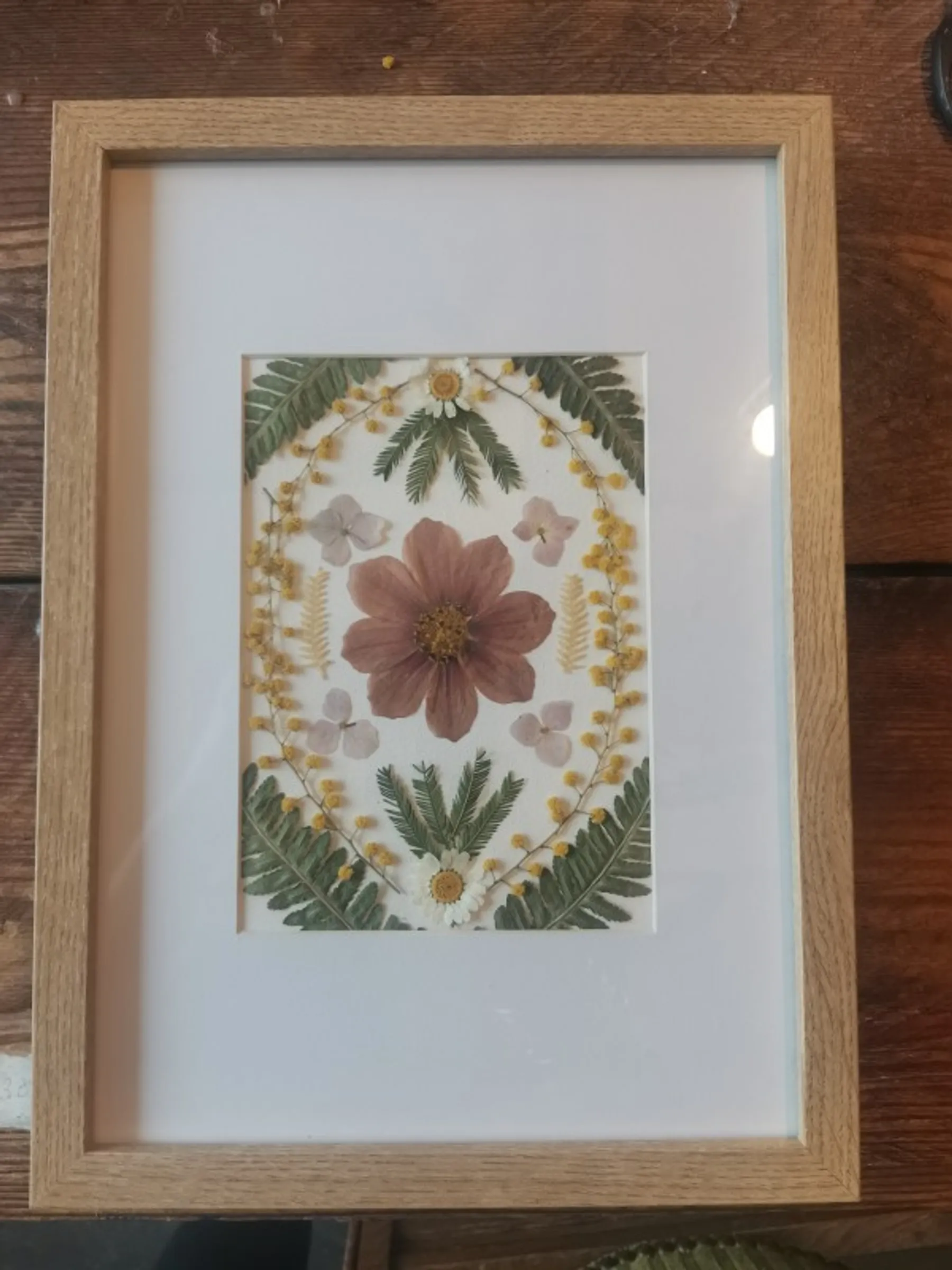 Vous avez maintenant entre les mains votre herbier, il ne reste plus qu'à coller délicatement chaque fleur sur la planche. On glisse la vitre par-dessus et le voilà prêt à être hissé sur un clou chez vous !