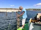 Une fois poussées, Yannick les bichonne en les mettant dans des sacs qu'il vient ensuite immerger dans l'étang afin de créer de "fausses marées". Et oui, nous en sommes en Méditerranée ici donc les marées se font à l'huile de coude ! C'est l'une des particularités de l'élevage conchylicole de l'étang de Thau : un élevage en suspension réalisé grâce à des "tables" constituées de rails soutenant des traverses et des perches croisées.