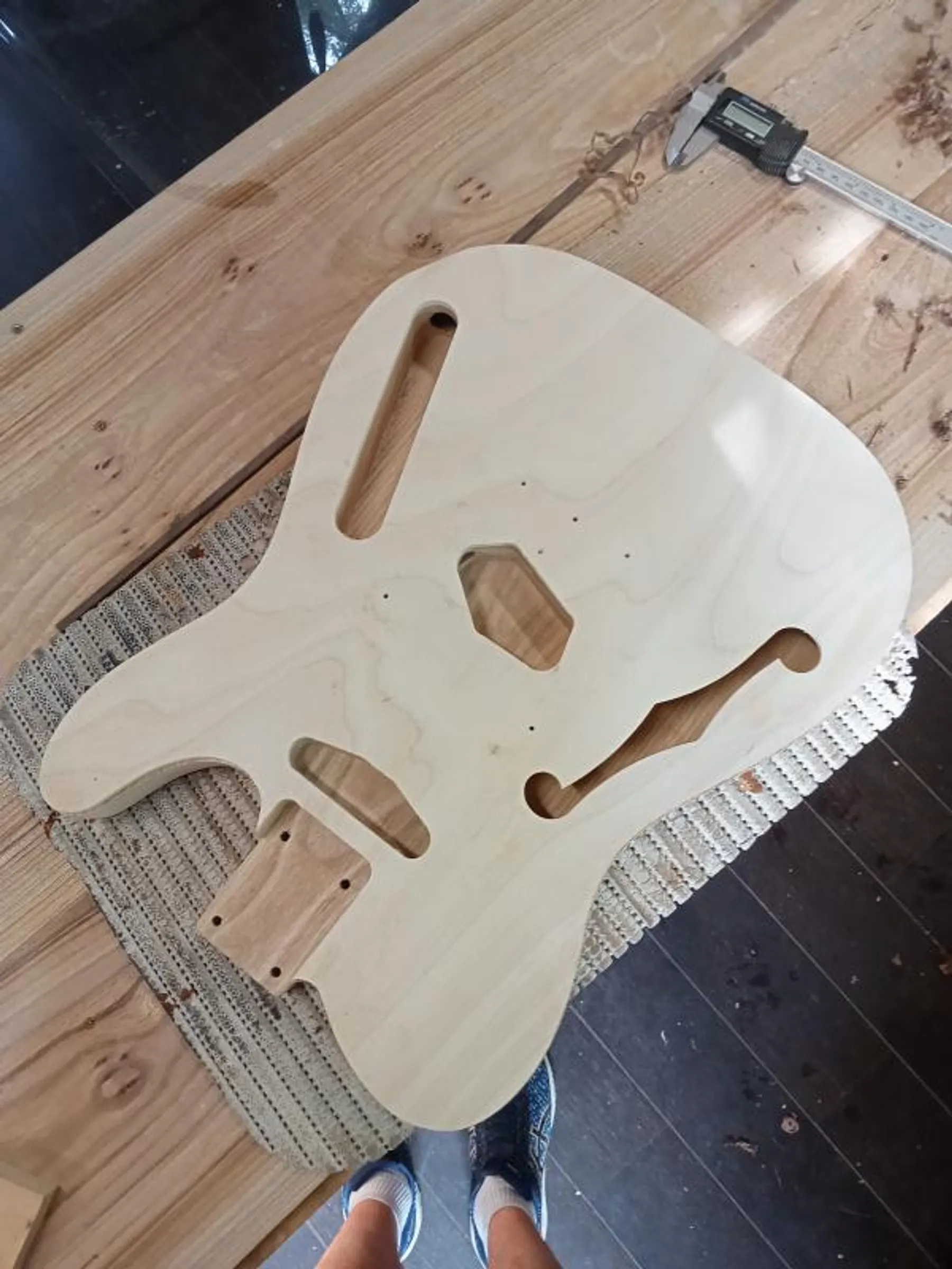 L’atelier commence par une présentation détaillée du kit et des différents modèles disponibles : Télécaster, Stratocaster, Jazzmaster, Les Paul, Hollow, Thinline, Parlor électrique… et bien d’autres sur demande préalable. Joachim vous guide ensuite dans la préparation des éléments en bois, avec le rabotage, le ponçage et l’application d’une finition naturelle huilée ou cirée.