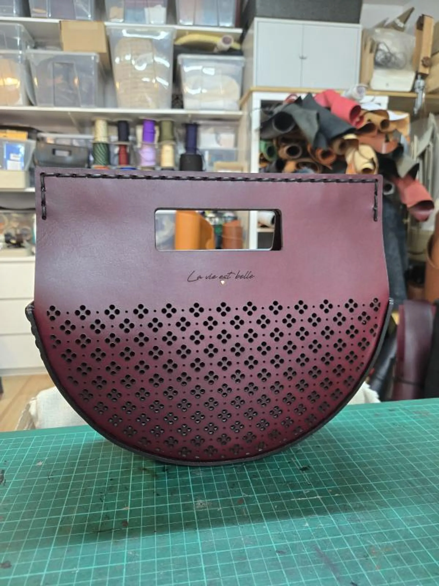Ensuite, laissez libre cours à vos inspirations en choisissant votre cuir, les finitions métalliques, la sangle, le pochon interne, et surtout, le motif qui rendra votre sac unique. Puis, lancez-vous dans la découpe du cuir à la main, avant de passer à l'étape magique de la découpe au laser, qui donnera vie à votre chef-d'œuvre.