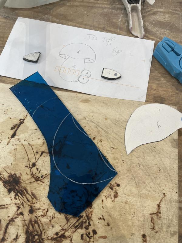 Pour le plomb, une fois la découpe du verre faite, vous définirez sur papier ce qu'on appelle "le chemin de plomb", c'est-à-dire l'ordre dans lequel on monte les pièces de verre, chemin que vous suivrez pour votre propre montage. Puis, vous souderez votre vitrail au recto et au verso.