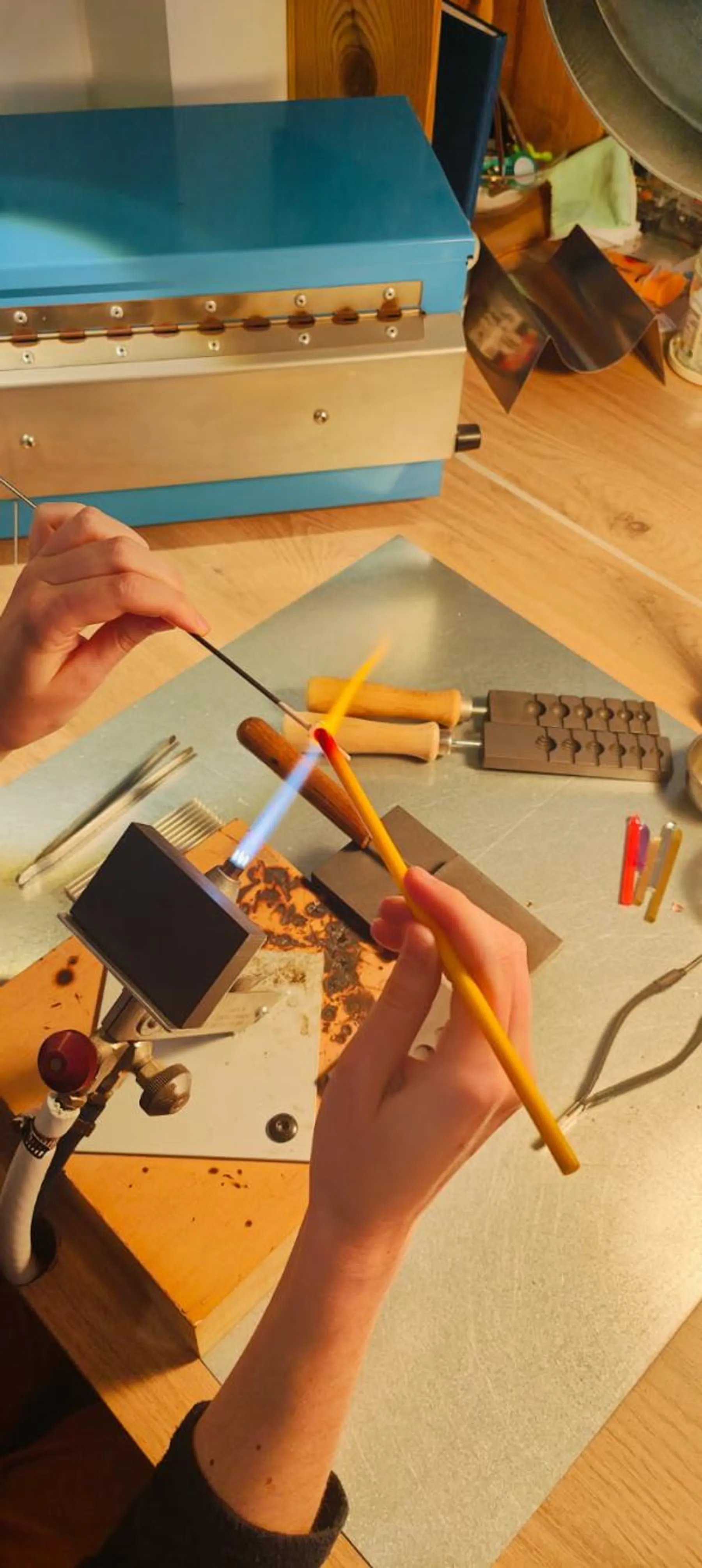 • Filage de verre : guidé par Pauline, découvrez comment enrouler le verre fondu autour d'un mandrin en métal, en jouant avec la gravité pour former une perle parfaitement ronde. Personnalisez davantage votre création en y ajoutant des décors tels que des points.