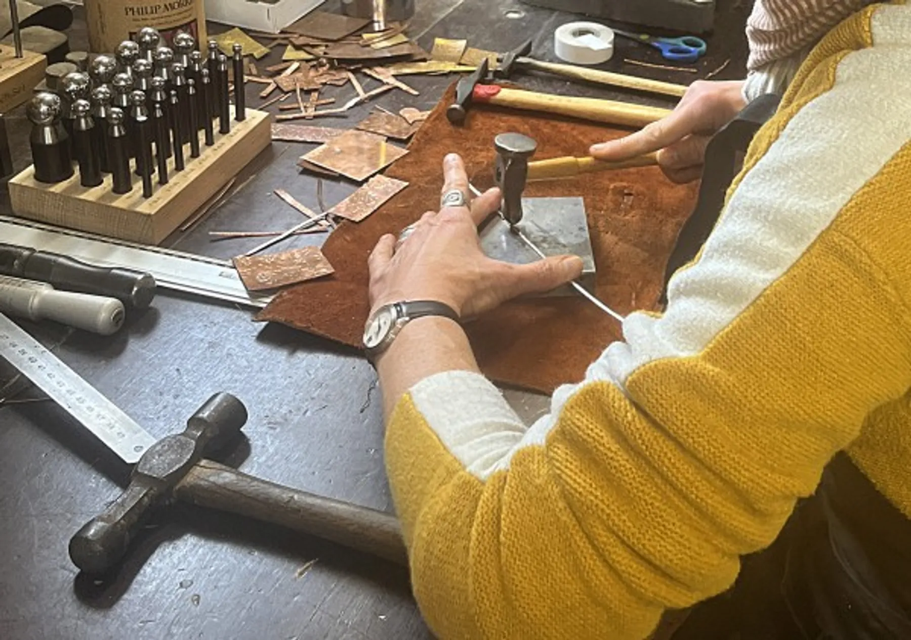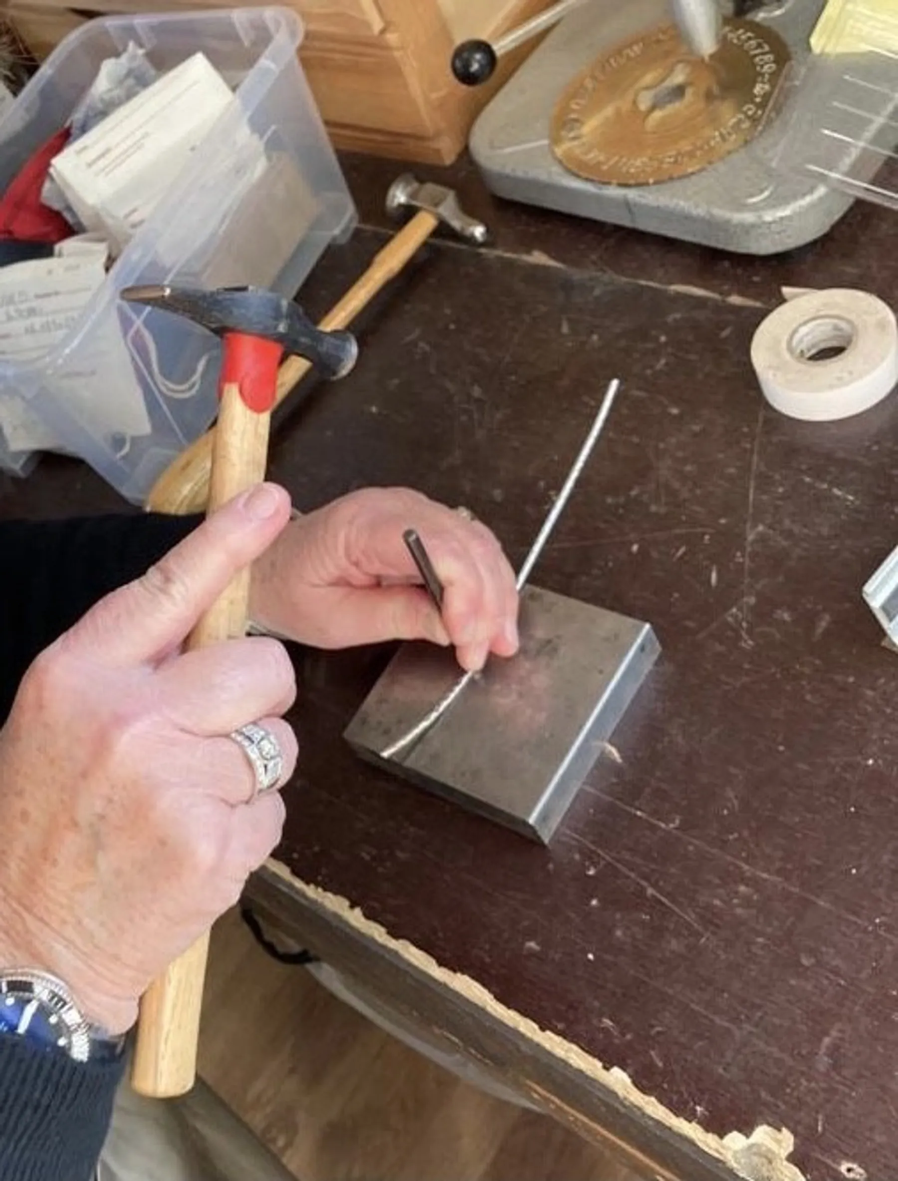 Vous apprendrez dans un premier temps à mesurer votre taille de poignet. Ensuite viendra l'étape de texturer une bande d'argent par la méthode du martelage du métal et à couper pour ensuite la souder.
