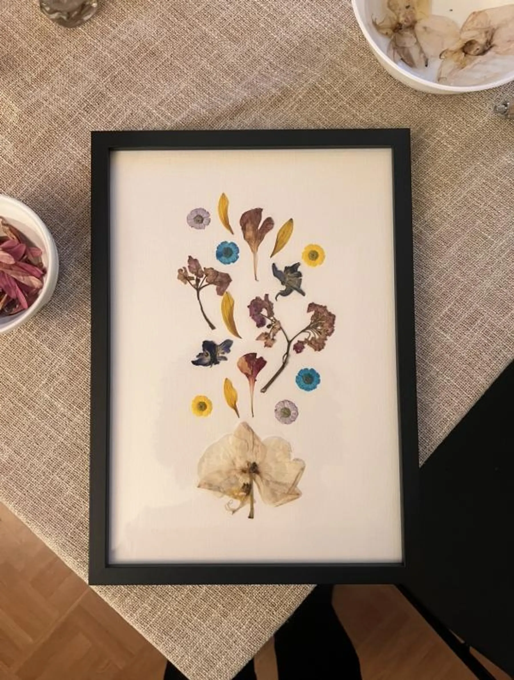 Vous commencerez par disposer librement les pétales, en jouant avec les couleurs et les formes, avant de fixer délicatement chaque élément. L'artisane sera à vos côtés tout au long du processus pour vous guider dans la maîtrise des gestes clés et vous aider à encadrer votre composition avec le cadre que vous aurez apporté.