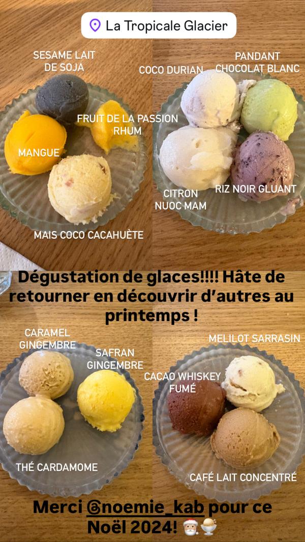 Et quand on parle de glace, on en parle très sérieusement à la Tropicale : leurs compositions relèvent de la glacestronomie ! Tout d'abord, le jeu de texture entre les glaces crémeuses, granités, ou végétales, un peu entre les deux.
