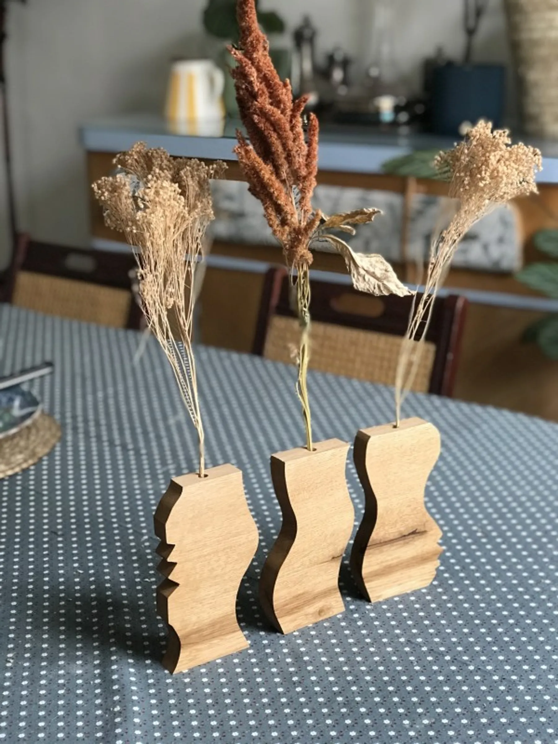 À l'aide de la scie à chantourner, vous découperez habilement le chêne brut pour donner forme à vos ouvrages. Le moment de la créativité est également celui de la fonctionnalité, car vous percerez le centre des vases afin de pouvoir y placer de charmantes fleurs séchées.