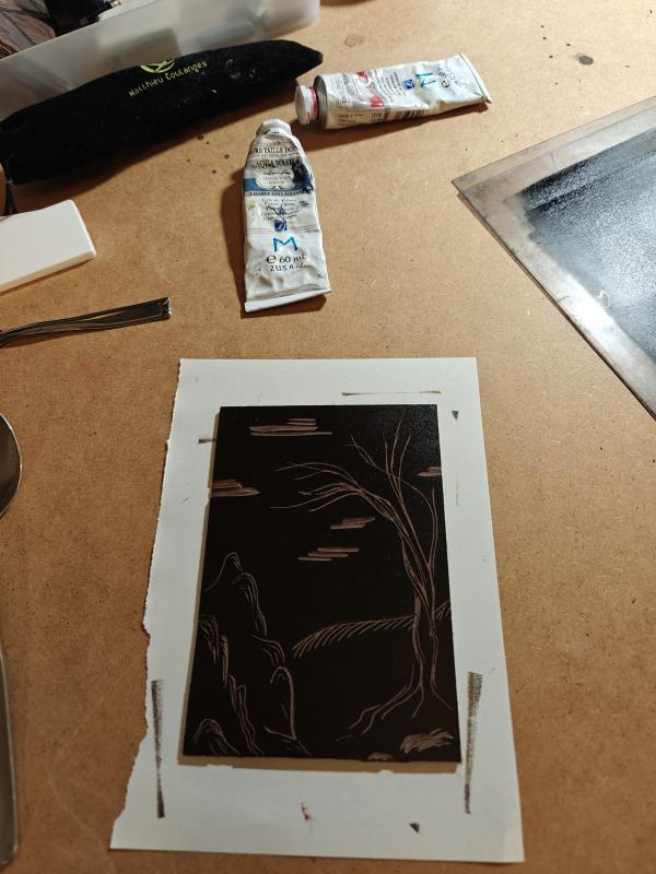 Ca faisait longtemps que je voulais tester la linogravure. J'ai beaucoup apprécié cet atelier en 3 temps : dessin, gravure et encrage. C'est bien d'avoir 3h pour trouver l'inspiration, faire des essais, tirer plusieurs images. Mathilde est à la fois présente pour nous guider et assez discrète pour qu'on s'approprie le lieu et la technique. C'était vraiment bien !