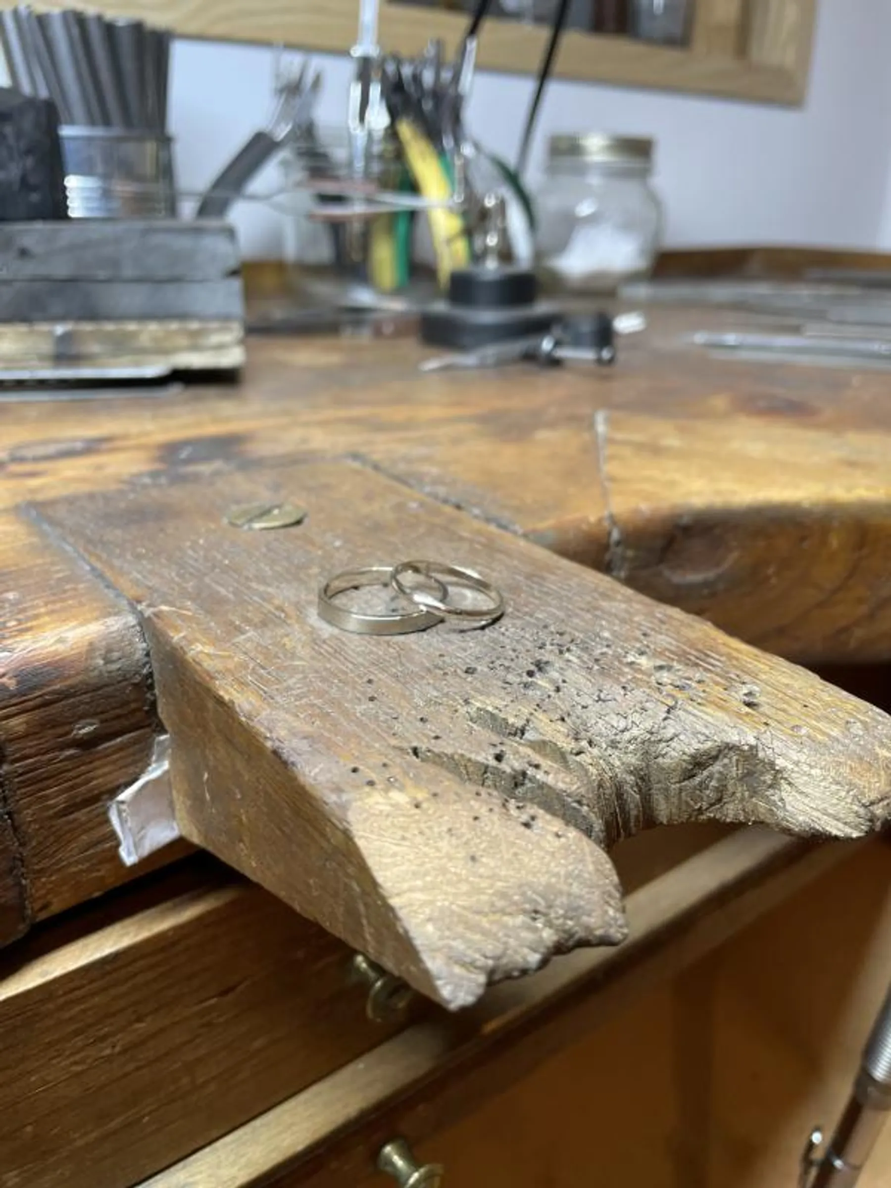 Le jour J, vous découvrez l’univers du métier de joaillier : les outils, les gestes, les étapes de fabrication. Après avoir pris vos tailles, place à la pratique. Vous découpez l’or à la scie, formez vos anneaux à l’aide du triboulet et du maillet, puis brasez au chalumeau pour refermer parfaitement chaque alliance. Finitions et ajustements viennent parfaire votre travail.